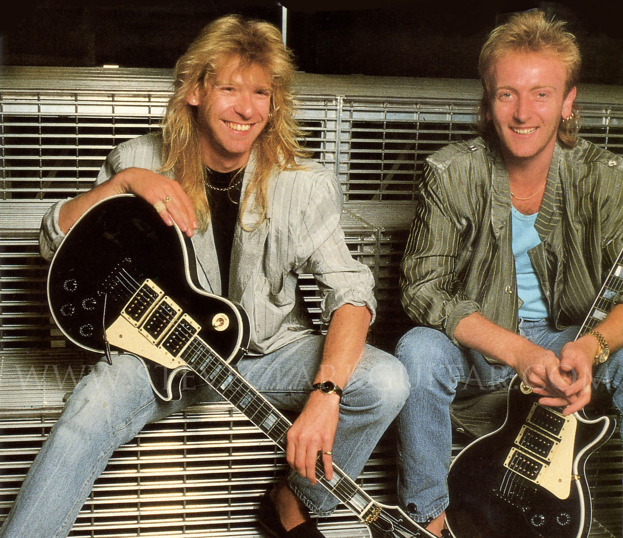 I joined Leppard guitarists Phil Collen and Steve Clark, in England for just the day in order to get a batch of interviews out of the way, for a drink and to share a couple of bowls of those highly-spiced nibbles that make you extremely thirsty and are always put out on the bar at places where the drinks are expensive.