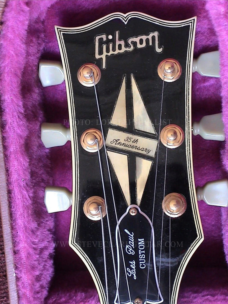 Steve used this guitar for the performance on the MTV Awards show in Los Angeles, California in 1989 and was photographed with it on a number of occasions. One of the easiest ways to tell that this is a special edition model is by the inscription of “35th Anniversary” on the centre band of the split diamond inlay on the headstock. These guitars also have a special vintage style serial number starting with a 9 I believe. Traditional Black Beauty class, this guitar has the usual Gibson appointments including gold hardware, ebony fretboard, mother of pearl inlays, vintage style tulip tuning pegs, multi-ply binding.